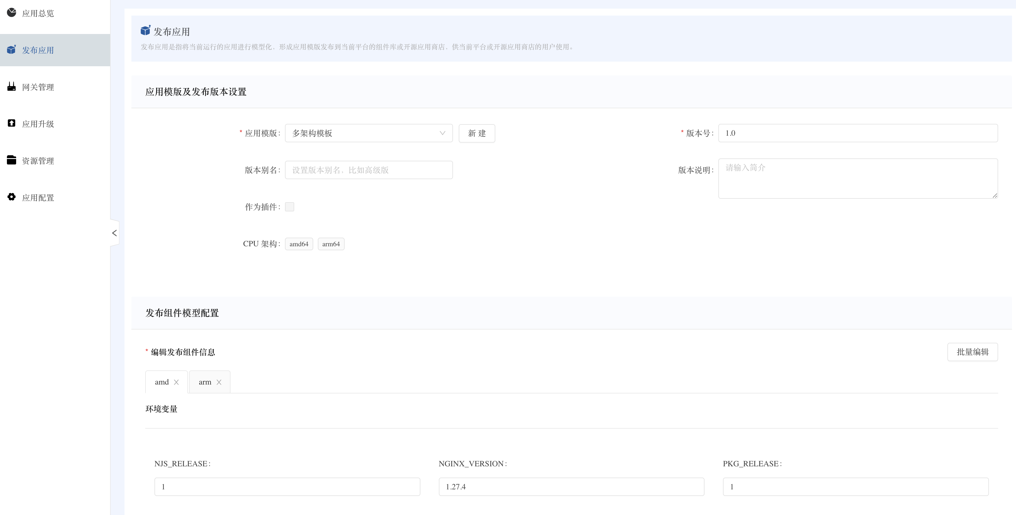 发布指定架构的应用模板